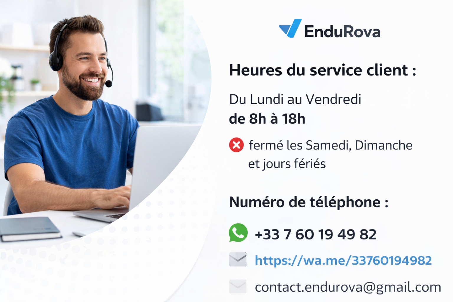Heures du service client : Du Lundi au Vendredi de 8h à 18h fermé les Samedi, Dimanche et jours fériés